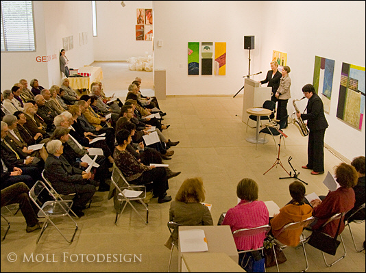 Sechs Autorinnen haben sich mit den Arbeiten der zwölf Künstlerinnen beschäftigt, entstanden sind Gedichte, kurze Prosa und essayistische Betrachtungen, die mit den Kunstwerken in einem Dialog stehen und das Sichtbare im Wort perspektivieren. Die Zusammenführung der Künste in einem kreativen DIALOG wurde durch Saxophon-Improvisationen von Marie Christine Schröck begleitet. (Quelle: GEDOK Dialog)
